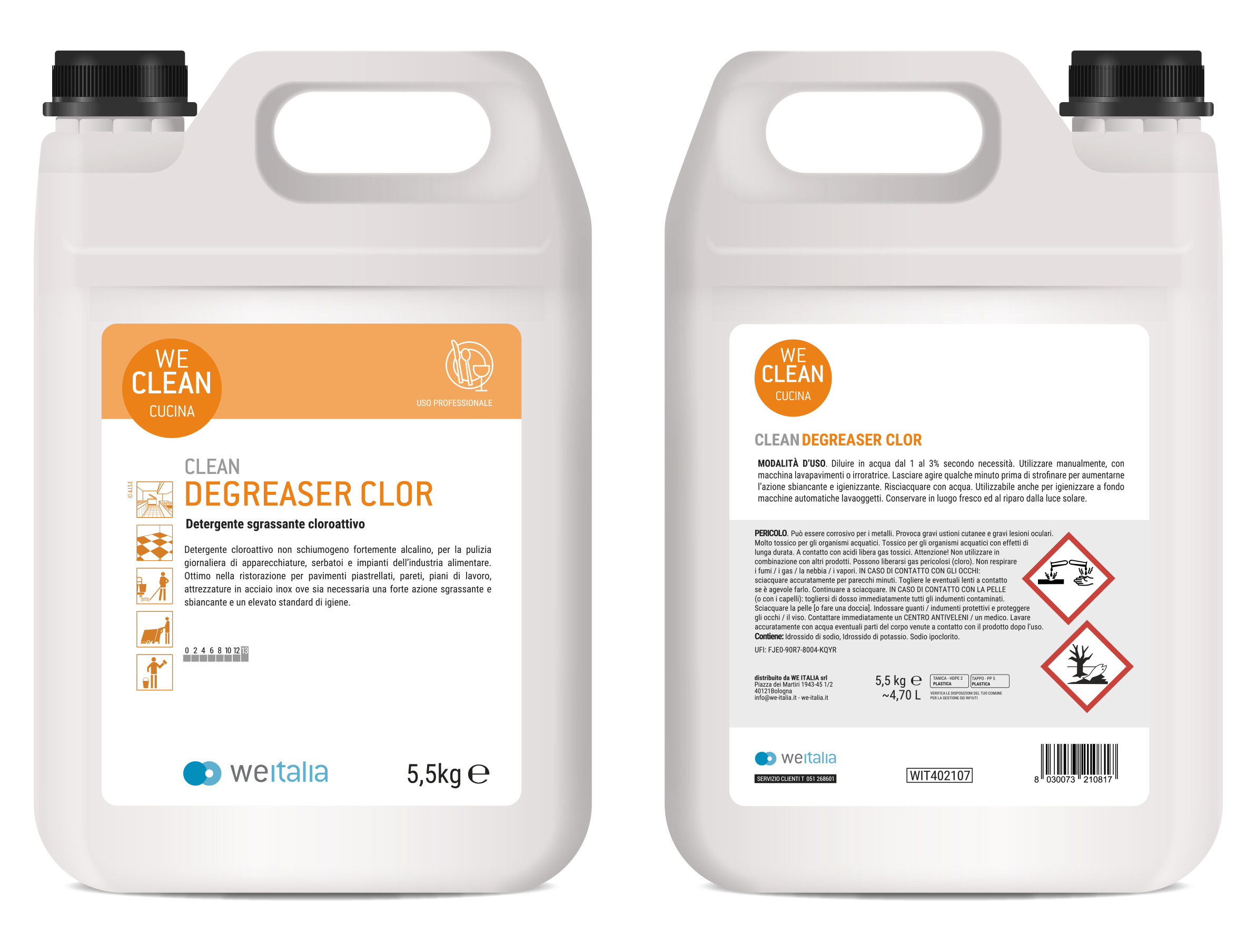 Prodotto a forte componente alcalina indicato per il trattamento giornaliero di superfici, impianti e attrezzature resistenti al cloro. Lelevata alcalinità lo rende particolarmente attivo nei confronti di sporchi organici, grassi ed unti, sia di origine animale che vegetale mentre il cloro attivo contenuto gli consente di esercitare una forte azione sbiancante, deodorante ed igienizzante. Particolarmente indicato per pavimenti antiscivolo che pulisce e sgrassa in profondità lasciando pulite anche le fughe. CLEAN DEGRESER CLOR è idoneo per piani digiene secondo il Regolamento HACCP ed anche per la pulizia in impianti C.I.P.