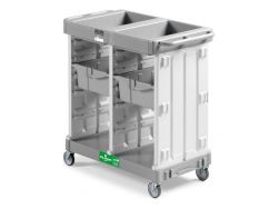 Carrello ARKA 24 in plastica lt. 28 composto da telaio con ruote diametro 80 mm con paracolpi, impugnatura ad "u" strizzatore rullo, secchio lt. 28 con 2 manici in plastica e divisorio amovibile, manubrio con rinforzi, portasacco lt. 100 con rinforzi e co